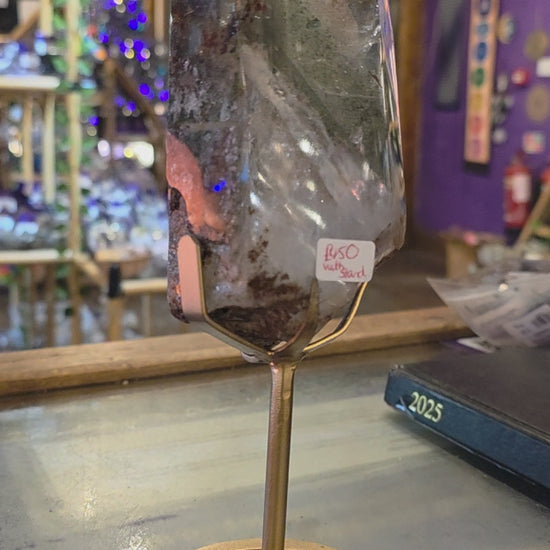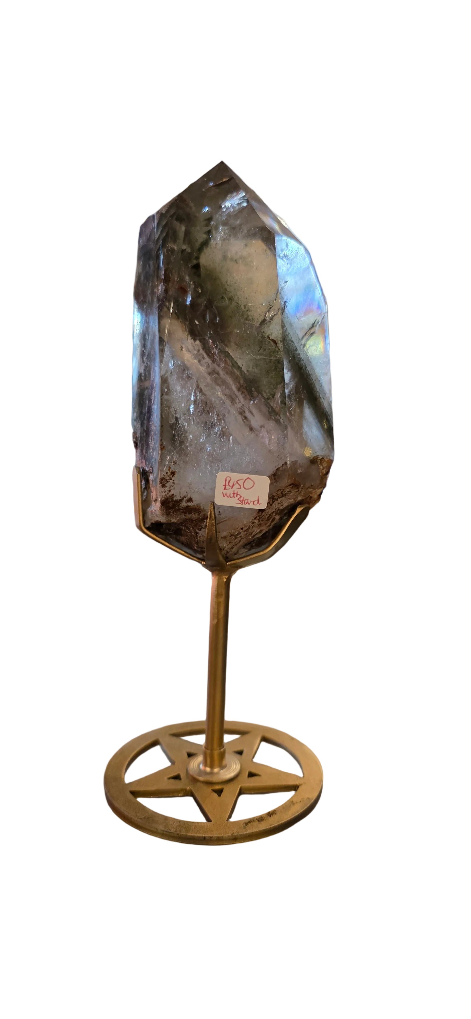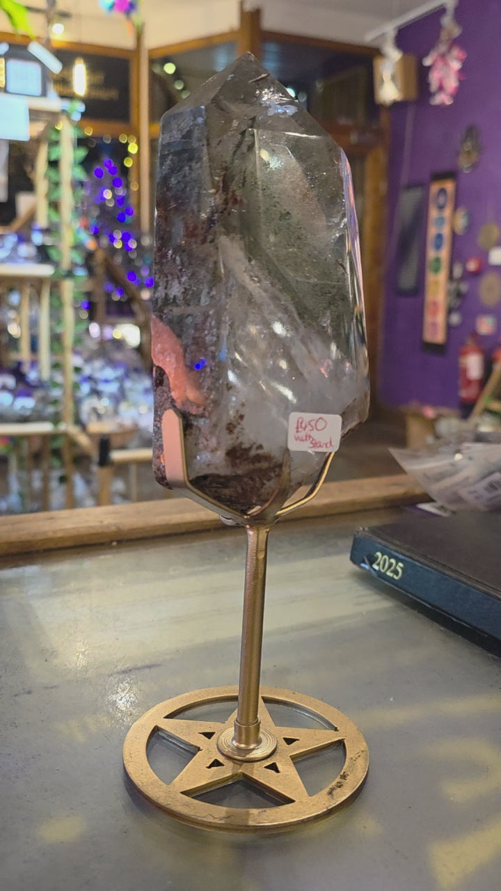 A portal of clarity and grounded magic, this faceted garden quartz crystal is more than a showpiece—it's a ritual anchor. Nestled in a golden pentagram base, it channels elemental harmony and protective energy, making it ideal for altar work, manifestation, or simply elevating your sacred space.