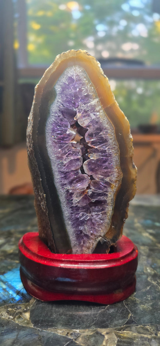 Amethyst Geode Slice on Wooden Base
